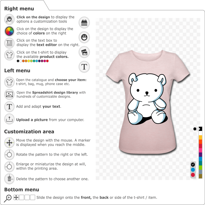 Click on the selected t-shirt to change the color, to the right of the designer. To change the teddy bear colors click on the design and the color menu appears on the right. You can also choose your t-shirt printing mode, flocking or lazer transfer.