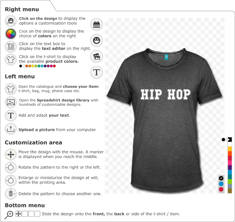 Create your unique t?shirt online with this music design. Thanks to the vector format of the design, you chan chage the color in the customization frame. You can print the words hip hop in white on black t-shirt or dark base, or in black on white or light background.
