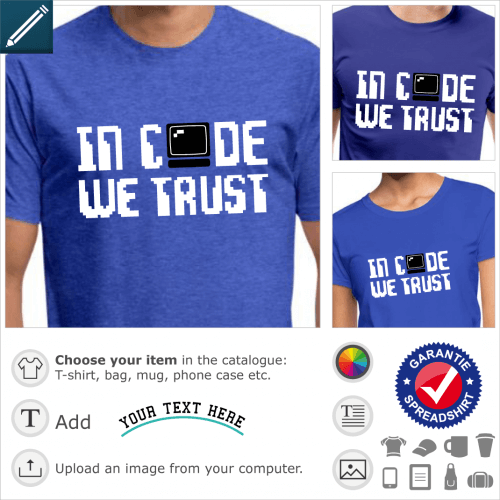 The formula In Code We Trust is a nerd parody of the motto on the US dollar, In God We Trust. The text is divided into two lines of equal width. The characters in the upper line are slightly larger than the lower line. The computer pictogram is drawn in black and white, and the text is in a third color. You can change these print colors in the Spreadshirt designer to completely customize the design.
