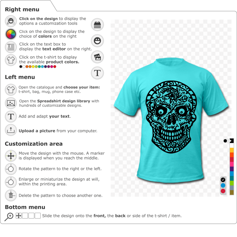 Calavera custom t-shirt. The skull and its floral patterns are drawn in relatively thick lines, leaving transparent areas between the patterns. It is plotted in vector format, which allows you to choose the printing color, and to enlarge the design at will without losing sharpness of the contours. Choose your t-shirt to customize - or a solid accessory, mug, case, etc. or a bag - to the left of the designer in the Choose a product menu. Once the t-shirt has been selected, adjust the skull size and place it on the printable surface, using the markers to center it (the markers are displayed when the skull is in the middle of the t-shirt or holder.)