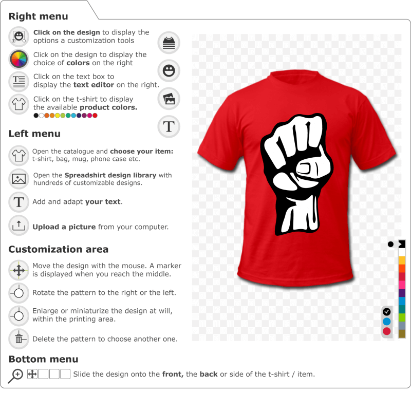 Stylized raised fist, Revolution design drawn in two-color solid colors and black lines. The fist is drawn in vector format, which allows you to change the size at will and change the colors. Adjust the size of the design. You can enlarge it to cover almost the entire height of the printing surface, or you can miniaturize it. To display the customization tools click on the fist. To the right of the designer is the color menu. You can choose other tones for printing, simply choose shades with approaching contrast to bring out the volume and shadows of the raised fist. To change the color of the t-shirt click on it and then make your choice from the menu on the right. To the left of the designer you can add a custom text, and set the font and size in the text editor that appears. You can also select another t-shirt model, by displaying the gallery of items available for customization - many t-shirts for men and women, accessories, cups, mugs or bags to print.